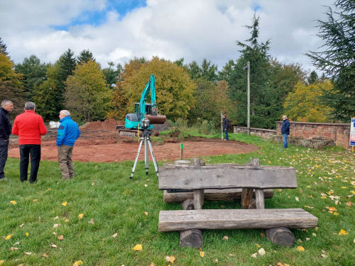 Ce mardi 14 octobre, une autre étape a été franchie avec les travaux des fondations. L’emprise au sol, circulaire, était déjà visible en cours de matinée. Les travaux s’effectuent sous l’égide de l’architecte du Parc naturel régional des Vosges du Nord, Claude Eichwald. « C’est le maire de Weiterswiller, où les Fleckenstein avaient des possessions », glisse Charles Schlosser.