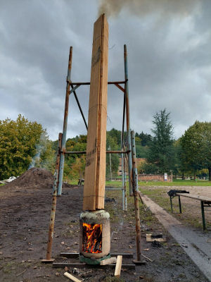 Jeudi 9 octobre au matin, les membres de l’association ont commencé à brûler des planches de bois. Elles serviront à donner à l’extérieur du futur espace de médiation un aspect similaire à celui d’une meule. Aussi bien par sa forme que par sa couleur.