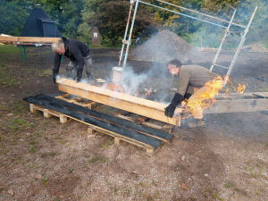 Trois planches ont été reliées de façon à former une cheminée triangulaire. Celle-ci a ensuite été placée au-dessus d’un foyer. Une fois retirées, les planches ont été détachées et arrosées à grande eau pour mettre fin à la combustion. Une opération qu’il faut répéter… 200 fois afin d’obtenir les 240 m 2 nécessaires.